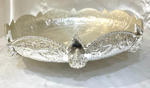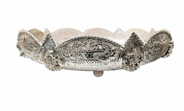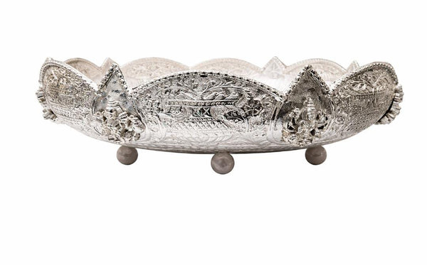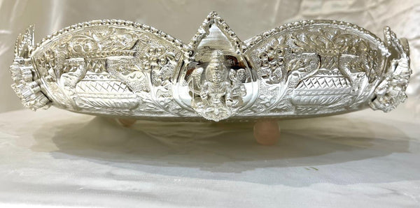 A large beautiful, silver-plated Urli with intricate carving of kalash and Laxmi ji all around. Perfect for filling water with floating candles and flowers.