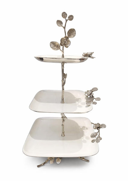 An orchid branch 3 tier silver-plated with white enamel platter. Easy to assemble.